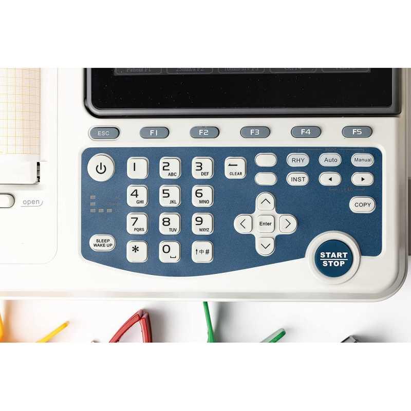 Leve, incluindo a bateria (2,25 kg para o dispositivo de 3 canais e 2,4 kg para o dispositivo de 6 canais), este eletrocardiógrafo oferece uma exibição abrangente de sinais cardíacos em uma tela LCD colorida inclinável de 7 polegadas. Ele tem a capacidade de exibir todas as 12 derivações em tempo real e oferece uma taxa de amostragem de 32.000 Hz.