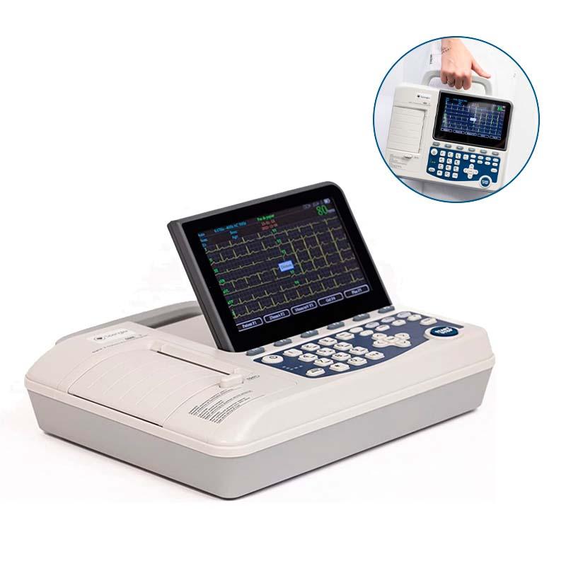 - Eletrocardiógrafo de 3 ou 6 canais com tela LCD colorida inclinável de 7 polegadas.